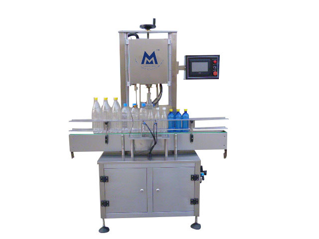 This is a semi machine made for the plastic drinking bottles. Because the bottles are too soft, it uses the piston to block and hold bottles, clamps the bottle neck with two pistons, then screw the caps under accurate positioning. It is in accords with GMP.